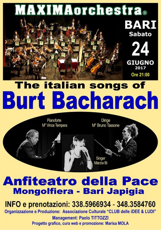 È attivo il servizio di “prenotazione biglietti” per assistere al meraviglioso Concerto/Spettacolo della MAXIMAorchestra “The Italian Songs BURT BACHARACH” diretto dall'insuperabile M° Bruno Tassone nel suggestivo scenario dell’Anfiteatro della Pace di BARI con gli originali virtuosismi strumentali della Guest-Star M° Vince TEMPERA al pianoforte e la suggestiva voce della Lead vocalist Marzia BI accompagnati da 30 eccezionali Musicisti della MAXIMAorchestra che interpreteranno successi indimenticabili di BACHARACH, nelle versioni italiane, tra cui Gocce di pioggia su di me, Non m'innamoro più, Magic Moments e tanti altri, su testi di Mogol, G. Calabrese, Don Backy, C. Minellono, Garinei & Giovannini, e di altri famosi autori, tutti arrangiati dall’insuperabile M° Vince Tempera.