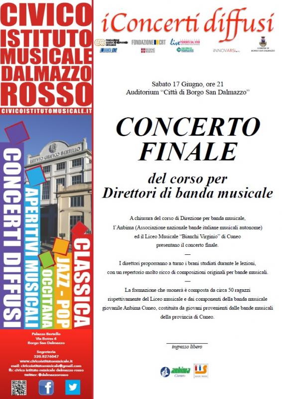 A chiusura del corso il 17 giugno 2017 alle ore 21,00, grazie alla collaborazione con il Civico Istituto Musicale Dalmazzo Rosso, verrà eseguito un concerto presso l’Auditorium “Città di Borgo San Dalmazzo”(ex Bertello) (g.c.), durante il quale i direttori proporranno a turno i brani studiati nelle lezioni. Il repertorio è molto ricco ed è strutturato da composizioni originali per bande musicali. La formazione che suonerà i brani è composta da circa 50 ragazzi rispettivamente del Liceo musicale e dai componenti della banda musicale giovanile Anbima Cuneo costituita da giovani provenienti dalle bande musicali della provincia di Cuneo.