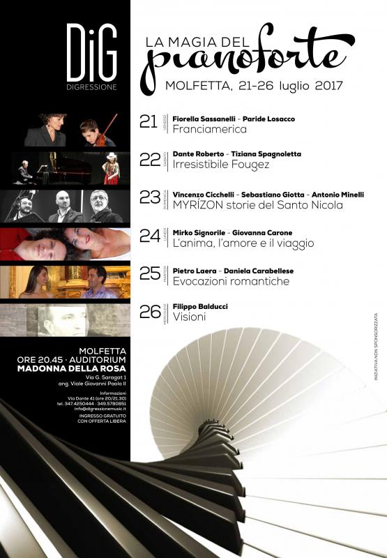 Dal 21 al 26 luglio 2017 andrà in scena presso l’Auditorium Madonna della Rosa di Molfetta, la prima edizione de “La Magia del Pianoforte”, rassegna promossa dall’etichetta Digressione Music e che rappresenta il corollario di una intensa attività discografica segnata da pregevoli produzioni che hanno raccolto unanimi consensi di vendite e critica in Italia ed all’estero. Si tratterà di concerti di rara bellezza ed intensità che vedranno protagonisti alcuni dei principali talenti della scena musicale pugliese, i quali daranno vita a veri e propri eventi unici nei quali protagonista assoluto sarà il fascino e la magia del pianoforte, ora come in solo esaltando il suo lirismo ora in duetto impreziosendo voci straordinarie. A raccontare il senso e la genesi di questa rassegna è don Gino Samarelli, fondatore di Digressione Music: “Come si suol dire: ‘chi si ferma è perduto!’. È vero. Ma ci sono cammini e cammini: c’è quello spirituale, culturale, naturalistico, ludico o salutare. Quello a cui siete invitati è la tappa di un cammino intrapreso nel 2007, vigilia della tanto temuta e tremenda crisi finanziaria. Un intreccio di varie istanze che portava il nome di “Digressione contemplattiva”: rompicapo filologico e divertita metafora di idee, progetti, bisogni e frustrazioni che in questi dieci anni sono cresciuti, sono stati corretti, si sono professionalizzati e sono diventati una società di produzione discografica e cinematografica, editore e studio di registrazione: Digressione Music. Con l’acquisto del pianoforte Fazioli e il festival “La Magia del Pianoforte”, Digressione inaugura una nuova tappa verso il traguardo dei cento dischi. Ambizione e realismo, difficoltà e utopia, accompagneranno il percorso; ci auguriamo di trovarci in tanti a salutare il traguardo”.