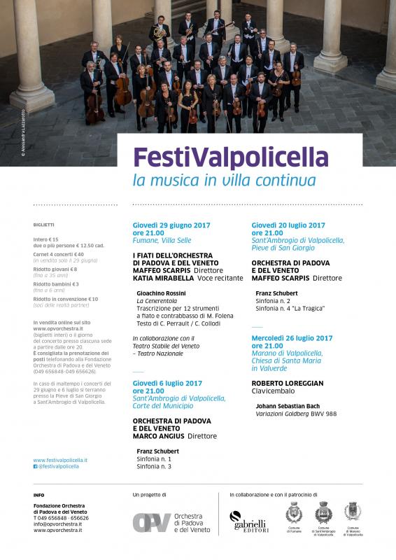 Il nuovo cartellone estivo raccoglie l’eredità di “Musica in Villa”. Dal 29 giugno al 26 luglio 2017 a Fumane, Sant’Ambrogio e Marano di Valpolicella con l’Orchestra di Padova e del Veneto diretta da Marco Angius e Maffeo Scarpis. In apertura una versione cameristica della “Cenerentola” di Rossini, nei 200 anni dalla prima rappresentazione dell’opera, con la giovane attrice veronese Katia Mirabella.