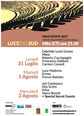 Stasera, lunedì 31 luglio, Luce del Sud apre i battenti alle 21.30 con Carmen Consoli e i suoi “echi di sirene”, seguiranno il pianista e compositore Roberto Cacciapaglia, il trionfatore di Sanremo Francesco Gabbani e due voci talentuose della musica italiana contemporanea che condividono i natali in Sicilia: la nissena Miele e la catanese Gabriella Grasso.