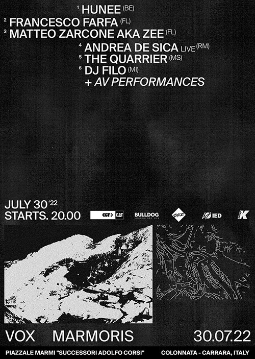 Sabato 30 Luglio 2022 nella spendida cornice del deposito marmi "Successori Adolfo Corsi" in Colonnata si svolgerà la 5° edizione VOX MARMORIS, un party straordinario di musica elettronica in grado di offrire un'esperienza multi-sensoriale unica nel suo genere, in una location d'eccezione: le cave di Marmo di Carrara.