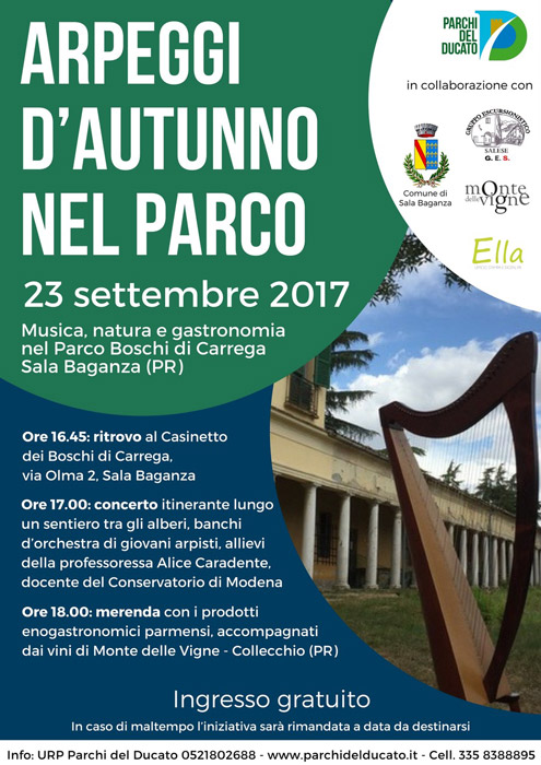 Sabato 23 settembre 2017 nel Parco Naturale Regionale Boschi di Carrega, a Sala Baganza (15 chilometri da Parma), Arpeggi d’Autunno nel Parco unisce i punti di un’esperienza musicale, gastronomica e naturalistica che vedrà impegnate molteplici realtà del territorio, strette intorno a un parco bellissimo e antico, pronto ad accogliere un pubblico affamato di stupore, sapori e conoscenza.