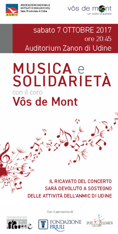 L'ANMIC di Udine, da sempre impegnata nella rappresentanza e nella tutela degli interessi morali e materiali dei mutilati e invalidi civili, promuove il 7 ottobre, alle 20.45, presso l'Auditorium Zanon di Udine, un concerto benefico con il coro "Vos de Mont", un raro esempio "coro d'autore" diretto dal Maestro Marco Maiero.