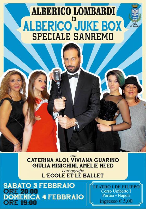 In concomitanza con il Festival di Sanremo 2018, sabato 3 e domenica 4 febbraio si svolgerà al Teatro I de Filippo di Portici lo spettacolo Alberico Juke Box Speciale Sanremo, in cui attraverso aneddoti ed indiscrezioni edizioni e soprattutto attraverso l'ascolto delle più belle canzoni del Festival si ripercorreranno le varie edizioni della manifestazione canora più seguita d'Italia. Da Tenco a Modugno, da Marcella ai Ricchi e Poveri, dalla Mannoia a Mia Martini, da Oxa/ Leali fino a Il Volo, e tanti altri i brani che ci hanno fatto sognare e che sono legati ai nostri ricordi più belli. Protagonista Alberico Lombardi, coadiuvato dalla giovane cantante Amelie Need e dalla showgirl Viviana Guarino che sarà accompagnata dal corpo di ballo di L'Ecole et le ballet. Conducono Caterina Aloi e Giulia Minichini. Due serate da non perdere che fanno parte della rassegna teatrale comunale Portici in scena ed hanno pertanto il costo di ingresso di 5 euro.