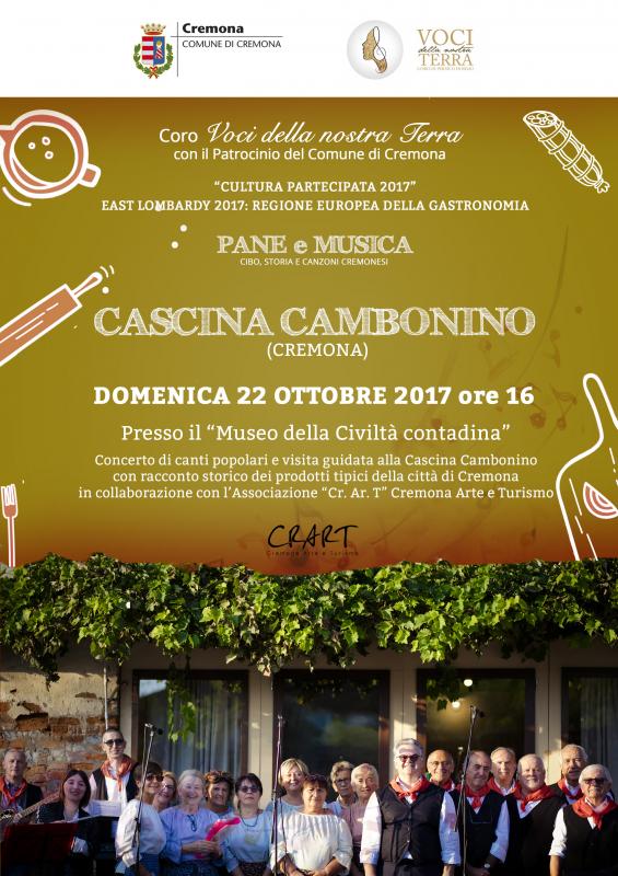Il coro “Voci della nostra terra” di Persico Dosimo (CR) sarà presente domenica 22 ottobre – a partire dalle ore 16 – alla Cascina Cambonino per un concerto di canti popolari cremonesi che hanno come tema di fondo il rapporto fra cibo, cultura e territorio. L’iniziativa rientra nel progetto “Cultura partecipata 2017” promosso dal Comune di Cremona, città che per il 2017 fa parte della “Regione europea della gastronomia”.