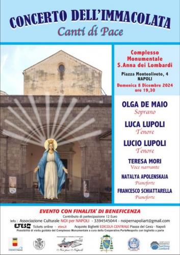 Il Tradizionale Concerto dell' Immacolata dell' Associazione Culturale Noi per Napoli anche quest'anno avrà luogo domenica 8 dicembre 2024 presso lo storico e stupendo Complesso Monumentale di Sant’Anna dei Lombardi,in Via Monteoliveto n.4 a Napoli alle h.19.30 ed avrà come titolo " Canti di Pace "