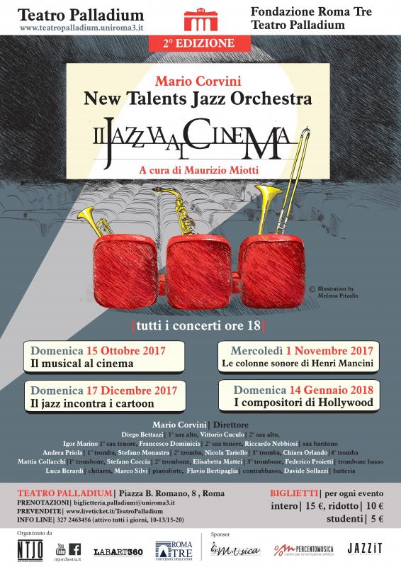 Domenica 14 gennaio 2018 alle 18 la New Talents Jazz Orchestra presenta al Teatro Palladium, per la rassegna “Il Jazz va al Cinema” ideata da Maurizio Miotti, l'appuntamento “I compositori di Hollywood”, un viaggio tra le creazioni di Ennio Morricone, Bernard Herrmann, Alan Silvestri, John Williams e Nino Rota: un nuovo live imperdibile per una delle grandi realtà nel panorama musicale capitolino (prevendite: https://bit.ly/14gennaioTICKETS).
