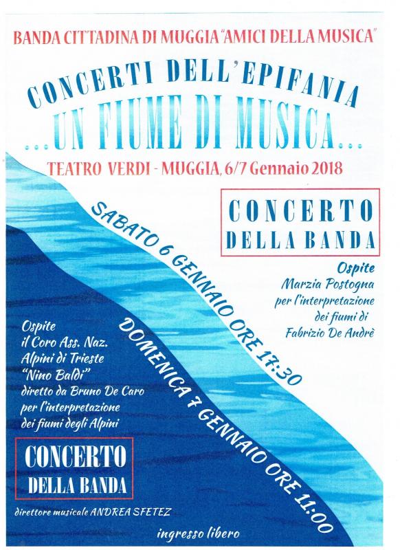 Il prossimo appuntamento augurale avrà luogo a Muggia presso il Teatro Verdi il 6 gennaio 2018 alle ore 17.00. In occasione del tradizionale concerto dell'Epifania, la banda ospiterà la vocalist muggesana Marzia Postogna - alla sua prima collaborazione con la formazione musicale di Muggia -, la soprano triestina Marianna Prizzon e alcuni membri della banda musicale di Obervellach, con cui è attivo un gemellaggio artistico sfociato in una collaborazione con la costituzione di un Coro misto per l’Advent Konzert (che dopo il successo di Muggia del 2 dicembre e di Gorizia del 3 ha replicato a Obervellach il 17 dicembre).