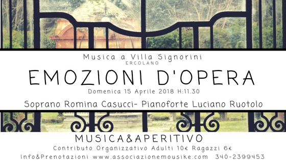 'Emozioni d’Opera’ è il titolo dell’ultimo incontro della rassegna 'Musica a Villa Signorini' organizzata dall'Associazione Mousikè nella suggestiva cornice della settecentesca dimora situata nell'antico 'Miglio d'Oro' ad Ercolano.