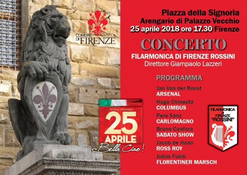 Ore 17.30 L'Arengario di Palazzo Vecchio, il palcoscenico più nobile di Firenze, ospita il Concerto della Filarmonica, un'ora e mezzo di grande musica per Wind Orchestra. Direttore Giampaolo Lazzeri. Più di cinquanta musicisti sotto lo sguardo del Marzocco, il maestoso leone della Repubblica Fiorentina.