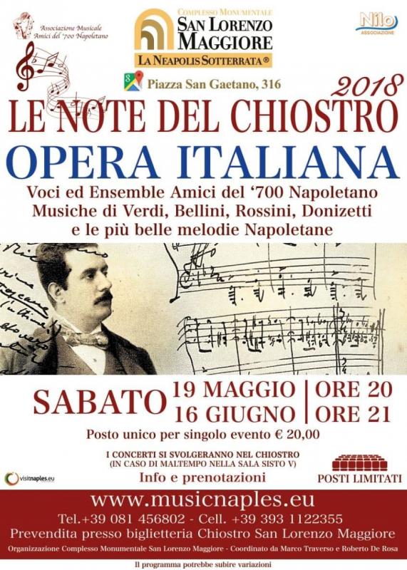 “Opera italiana" è il titolo del concerto ideato da Marco Traverso, che sarà eseguito dall’ensemble Amici del ‘700 Napoletano, con cantante soprano e mezzosoprano. L'opera di Verdi, Rossini, Bellini, Donizetti, ma anche melodie napoletane, concentrate in una sola serata.