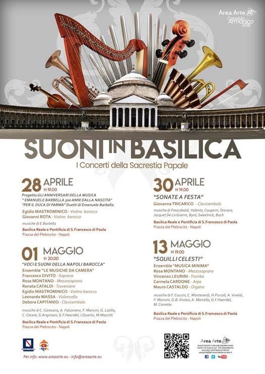 La Napoli barocca e la musica dei Maestri del Settecento Napoletano, ricchezza culturale e tradizione di vanto partenopeo, ritorna in quattro appuntamenti d’eccezione con strumenti d’epoca (il 28 e il 30 aprile, il 1 e il 13 maggio ) per il programma “Suoni in Basilica - I Concerti della Sacrestia Papale” presso la Basilica Reale e Pontificia di S.Francesco da Paola in Piazza del Plebiscito.Un mini ciclo di concerti che apre le attività musicali della prima parte rassegna CONVIVIO ARMONICO 2018 “….la sorgente della musica, il trionfo dei napoletani”, alla sua XVII edizione organizzato da AREA ARTE, Associazione Mediterranea Culturale.