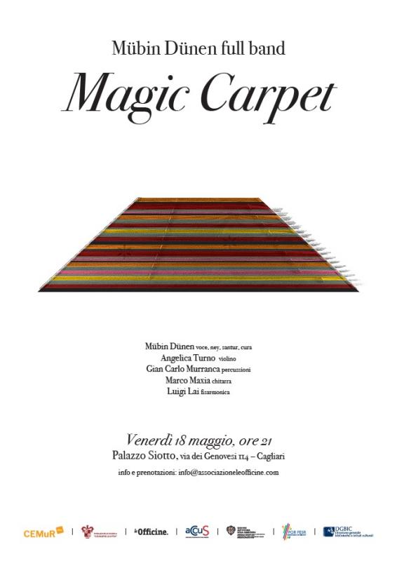 Venerdì 18 maggio alle ore 21 a Palazzo Siotto, via dei Genovesi 114, il musicista curdo Mübin Dünen presenterà un repertorio di composizioni originali e tradizionali curde e turche, eseguite con strumenti e stili tipici della sua terra. Ad accompagnarlo sul palco ci sarà il suo trio “Magic Carpet” composto da Giancarlo Murranca alle percussioni, Marco Maxia alla chitarra e Angelica Turno al violino e con la partecipazione di Luigi Lai alla fisarmonica.