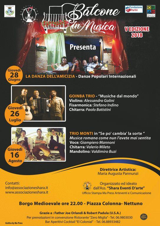 L’Associazione Shara (Nettuno) ha organizzato e presenta per giovedì 26 luglio dalle ore 22.00 in poi, nell’ambito della V° Edizione 2018 del Festival “Balcone in Musica e Spettacolo – Goinba Trio Musiche dal mondo” all’interno della magica cornice dell’antico Borgo Medievale di Nettuno(Rm).