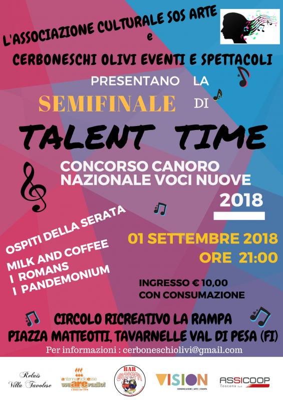 Talent-Time è iniziato nel mese di Giugno, dopo che gli artisti hanno potuto iscriversi sul sito della Cerboneschi-Olivi Eventi e Spettacoli e sabato primo settembre alle ore 21:00 si terrà la semifinale presso il Circolo la Rampa a Tavarnelle Val di Pesa (FI).