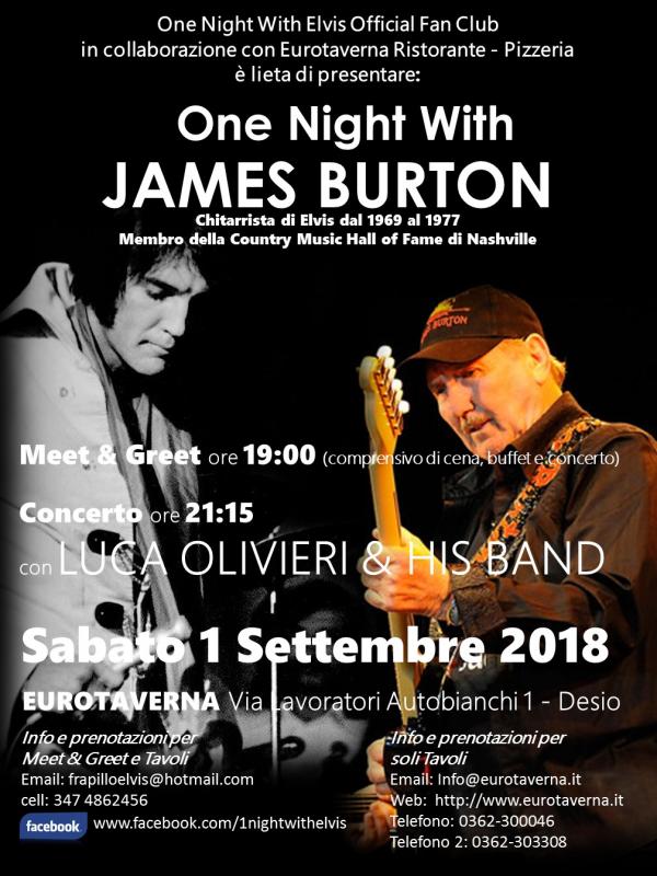James Burton: grande chitarrista sin dai tempi d’oro del rock & roll, ha accompagnato diversi musicisti di spicco della scena musicale statunitense, fra cui Bob Luman, Dale Hawkins, Ricky Nelson, Elvis Presley, Johnny Cash, Merle Haggard, John Denver, Gram Parsons, Emmylou Harris, Jerry Lee Lewis, Claude King, Elvis Costello, Joe Osborn, Roy Orbison, Joni Mitchell, Vince Gill ed Allen “Puddler” Harris.Dal 2001 è membro della Rock and Roll Hall of Fame, introdotto da un discorso di Keith Richards.Nel 1969, Elvis Presley chiese a Burton di partecipare al suo spettacolo a Las Vegas e questa volta Burton accettò. Entrò nella TCB Band e accompagnò Elvis dal 1969 sino al 1977, anno della morte di Elvis, senza perdere un solo spettacoloUn’occasione unica ed imperdibile qui in Eurotaverna