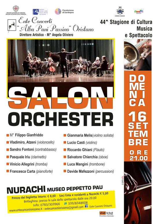 La Salon Orchester è una recente formazione nata con lo scopo di proporre attraverso la musica, un ideale viaggio nel cuore della Mitteleuropa , tra Settecento e Novecento, tra ritmi di danza e evocative e struggenti melodie, opere celeberrime e pagine rare. La nuovissima piccola orchestra da camera che comprende un quartetto d’archi, con il violino solista di Gianmaria Melis affiancato da Lucio Casti (violino), Vladimiro Atzeni (violoncello) e Sandro Fontoni(contrabbasso), e una sezione di fiati che schiera accanto a Riccardo Ghiani (Flauto), Pasquale Iriu al clarinetto e Salvatore Chierchia all’oboe, Vinicio Allegrini alla tromba e Luca Mangini al trombone, con Francesca Carta al pianoforte e Davide Mafezzoni alle percussioni. Un ensemble affiatato di eccellenti musicisti, per sfogliare un’antologia di capolavori emblematici della storia della musica, con un programma variegato e denso di suggestioni, in cui si intrecciano tradizione colta e modernità.