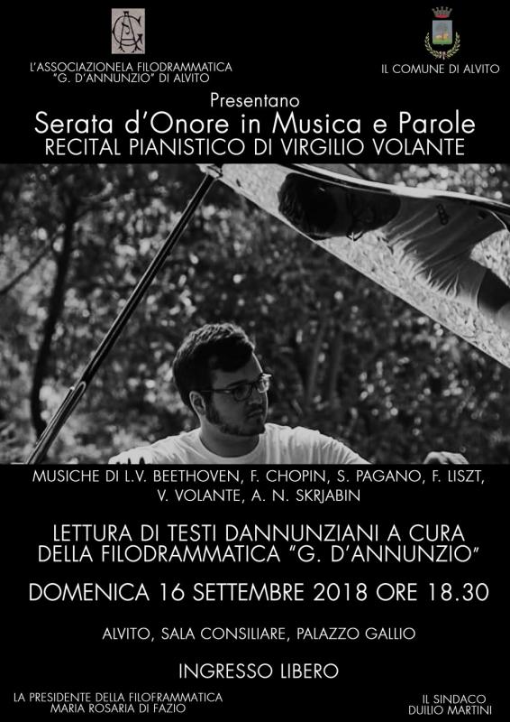 L'Associazione Filodrammatica "G. D'Annunzio", in collaborazione con il Comune di Alvito, organizza e promuove questo Recital Pianistico, inaugurando il Pianoforte donato da Enzo e Fiorella Samaritani al Comune di Alvito.