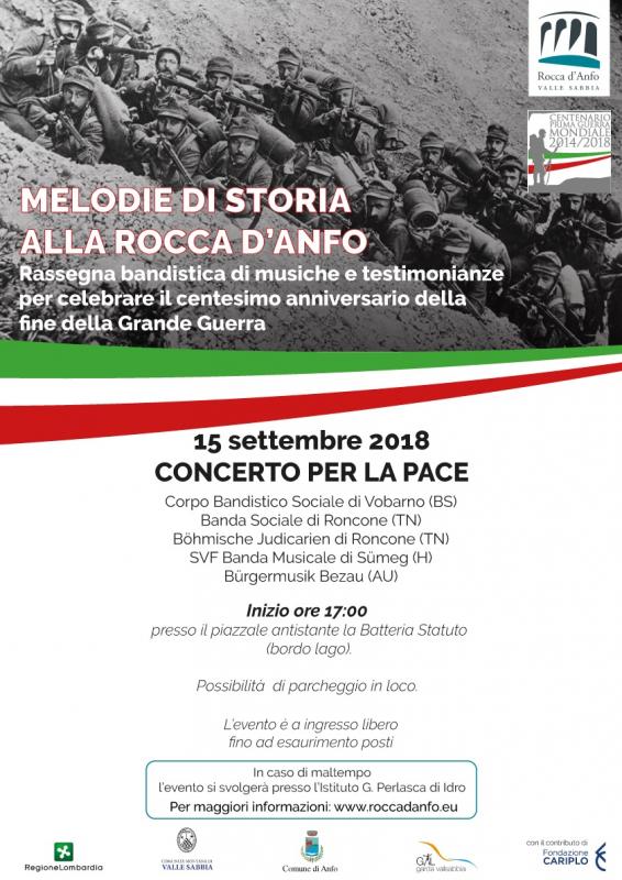 Sabato 15 settembre si terrà un evento internazionale, il CONCERTO PER LA PACEcon protagonisti il Corpo Bandistico Sociale di Vobarno (BS), la Banda Sociale di Roncone (TN), la Böhmische Judicarien di Roncone (TN), la SVF Banda Musicale di Sümeg (H) e la Bürgemusik di Bezau (AU).
