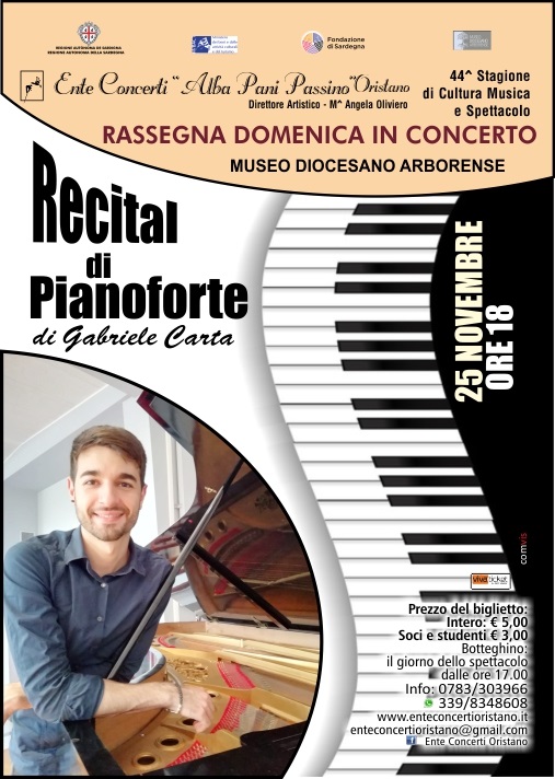 Domenica 25 novembre alle ore 18.00 presso la Sala “S. Pio X” del Museo Diocesano Arborense, ottavo appuntamento della IX^ Rassegna “Domenica in concerto” con il recital pianistico di Gabriele Carta. Il giovanissimo pianista oristanese è al suo primo concerto nella sua città.