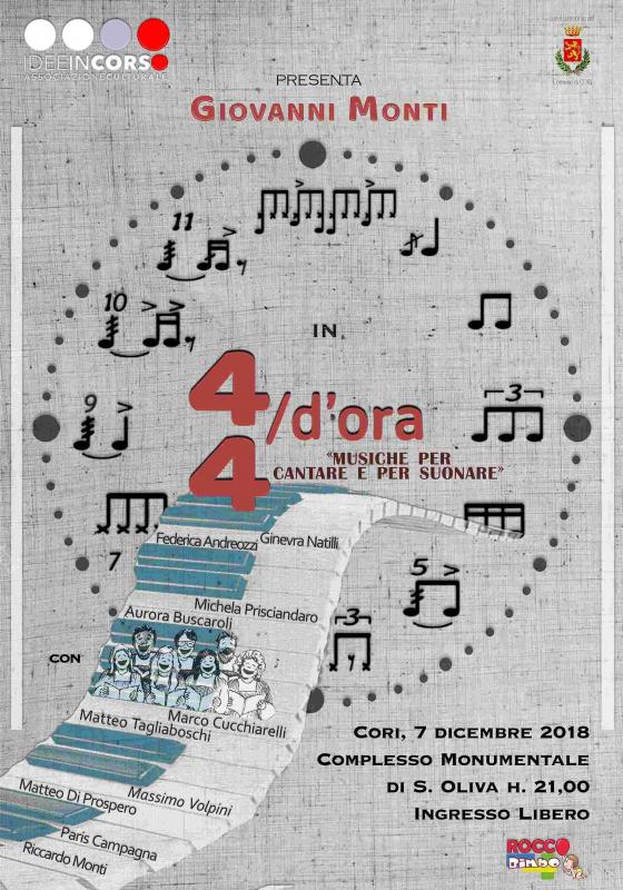 Venerdì 7 dicembre alle ore 21, nel complesso monumentale di Sant’Oliva a Cori (LT), il M° Giovanni Monti presenta 4/4 d’ora – “Musiche per cantare e per suonare”. Il concerto, che si compone di pezzi noti e originali, eseguiti in parte al pianoforte e in parte con sole voci, nasce dall'idea di ripercorrere temporalmente le tappe di una carriera di musicista in cui la passione per la musica vocale sistematicamente si alterna a quella per la musica strumentale. Si racconta così, secondo le parole dello stesso Giovanni Monti, «il personale cammino artistico di un "musicante artigiano", viandante e avventuriero che, attraverso l'esecuzione di brani originali, rivisti e riadattati, invita il pubblico a un'ideale navigazione in mare aperto dove le onde (sonore) e gli approdi risiedono in quell'immensa distesa di mare che con discreta immaginazione e abbondante fantasia definiremmo musica».