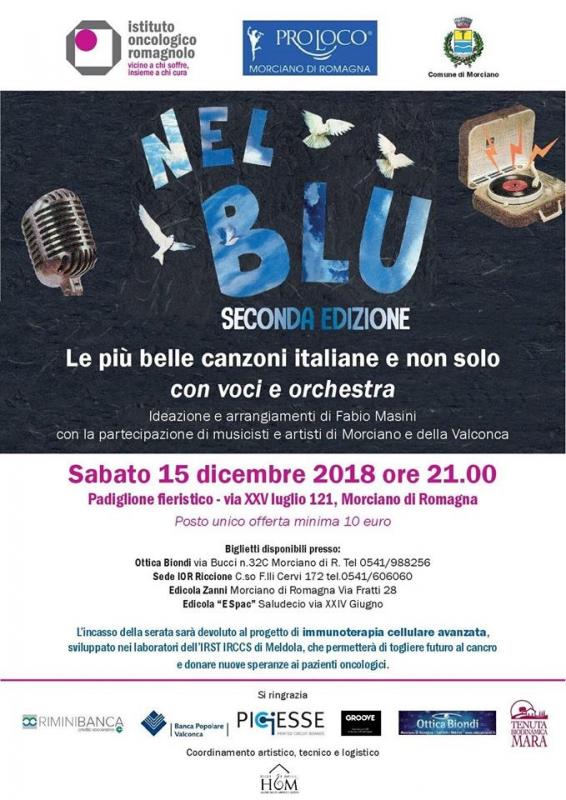 Morciano sale sul palco per aiutare lo IOR (Istituto Oncologico Romagnolo). La capitale della Valconca si prepara a fare il pieno di note con la seconda edizione di “Nel Blu”, evento di musica e solidarietà in programma sabato 15 dicembre 2018 a partire dalle 21 presso l’auditorium della Fiera di via XXV Luglio. Le più belle canzoni italiane di sempre (e non solo) faranno da colonna sonora a una serata all’insegna dello stare insieme e della beneficenza.Ideazione e arrangiamenti saranno curati da Fabio Masini, compositore e direttore d’orchestra. All’evento, promosso dal Dottor Geo Agostini e patrocinato dal Comune di Morciano, parteciperanno anche musicisti e artistiprovenienti da tutta la Valconca. L’incasso sarà devoluto interamente a favore dello IOR: in particolar modo si finanzierà il progetto di immunoterapia cellulare avanzata, sviluppato nei laboratori dell’IRST IRCCS di Meldola, che permetterà di togliere futuro al cancro e donare nuove speranze ai pazienti oncologici.