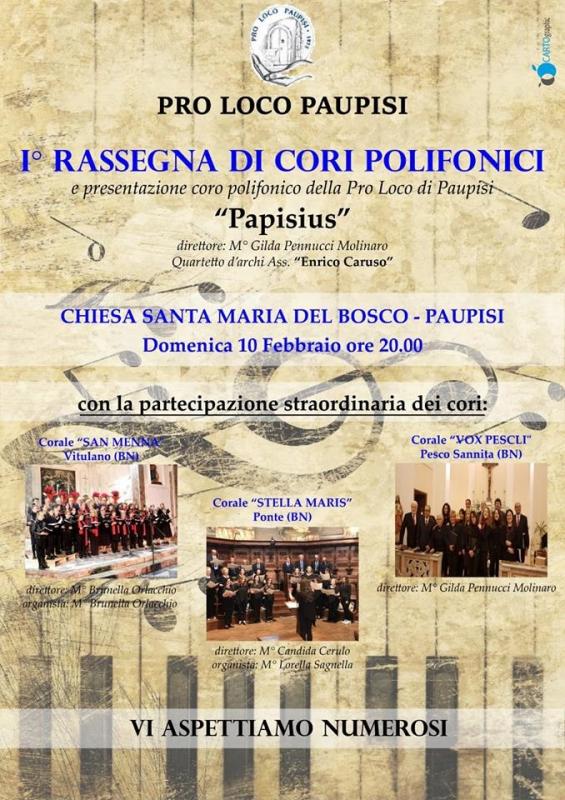 Alle ore 20,00 nella chiesa Santa Maria del Bosco, si esibiranno il coro polifonico ‘Papisius’ di Paupisi, creato dalla locale Pro Loco, che ha anche organizzato la rassegna;