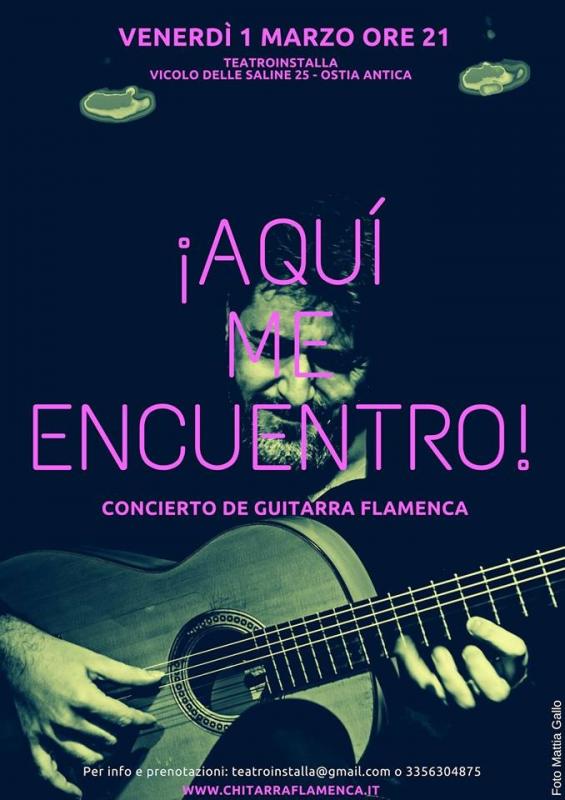 Le note del Flamenco del musicista Matteo D’Agostino creeranno una magica atmosfera venerdì I marzo 2019 alle ore 21 presso il “Teatro InStalla” di Ostia Antica (Vicolo delle Saline, 25) in occasione del concerto ¡Aquí Me Encuentro!, Concierto De Guitarra Flamenca. Ad eseguire le sue musiche sarà il chitarrista e compositore Matteo D’Agostino. Al suo fianco, al Cajón set, Luca Caponi. La prenotazione è obbligatoria all’indirizzo teatroinstalla@gmail.com o al numero 3356304875.