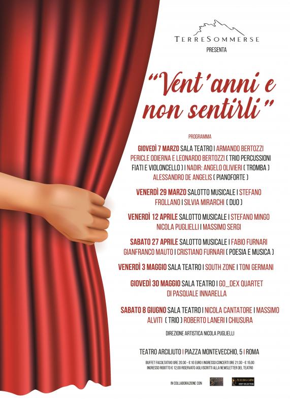 Inizia il 7 marzo la rassegna musicale “Vent’anni e non sentirli”, iniziativa della casa editrice e discografica Terre Sommerse che si svolgerà presso il Teatro Arciliuto di Roma (Piazza Montevecchio, 5) e che si concluderà dopo sette concerti-evento l’otto giugno.