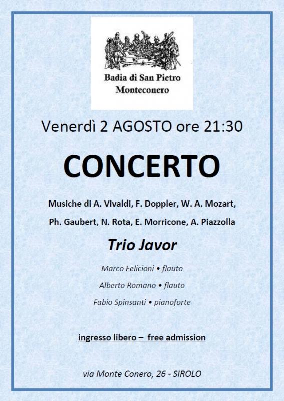 Il giorno 2 Agosto 2019 alle ore 21:30 si terrà a Sirolo presso la Badia San Pietro un concerto di musica classica del trio JAVOR due flauti e pianoforte (Marco Felicioni flauto, Alberto Romano flauto, Fabio Spinsanti pianoforte) concerto organizzato dall'Hotel Monteconero di Sirolo.