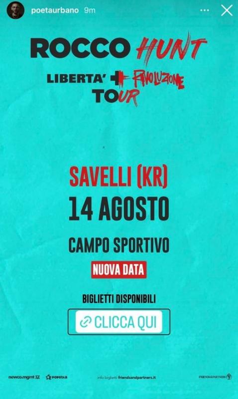 Ci sarà anche Rocco Hunt in concerto al Campo sportivo di Savelli (Kr). Dopo la data di Francesco Renga che sarà a Savelli il prossimo 16 agosto, è stato infatti annunciato il concerto di Rocco Hunt che arriverà in Calabria il 14 agosto per una data del “Libertà + rivoluzione tour”. Entrambi i concerti di Renga e Hunt sono già in prevendita, organizzati dall’Amministrazione comunale di Savelli.