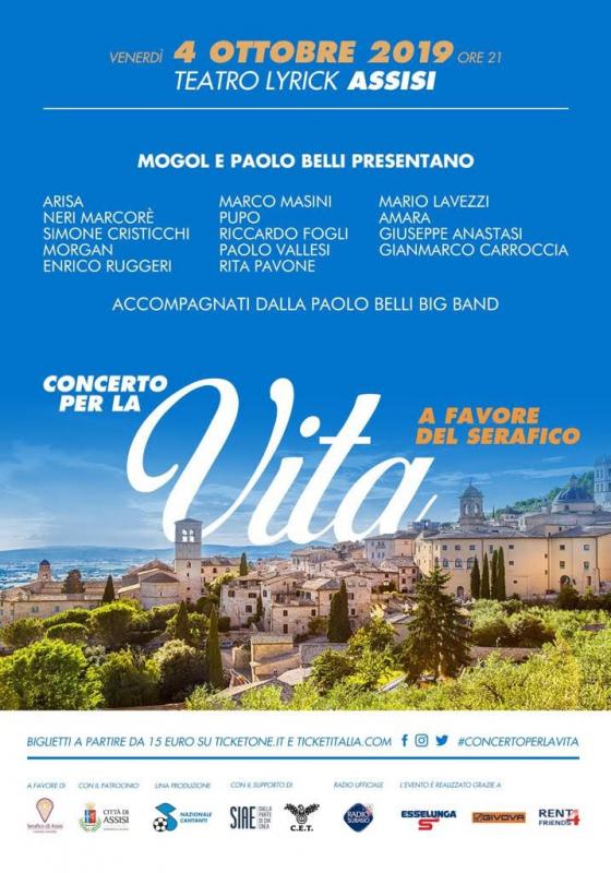 Nel giorno dedicato a San Francesco, in cui si celebra anche la giornata nazionale del dono, Mogol e Paolo Belli presenteranno, accompagnati dalla Paolo Belli Big Band, il Concerto per la Vita con Paolo Belli, Arisa, Neri Marcorè, Simone Cristicchi, Morgan, Enrico Ruggeri, Marco Masini, Pupo, Riccardo Fogli, Paolo Vallesi, Rita Pavone, Mario Lavezzi, Amara, Giuseppe Anastasi, Gianmarco Carroccia e altri ospiti a sorpresa. Tanti grandi artisti del panorama musicale italiano che si esibiranno ad Assisi per sostenere con l’incasso della serata l’Istituto Serafico di Assisi e per far conoscere l’esistenza di questo luogo a tutta l’Italia.