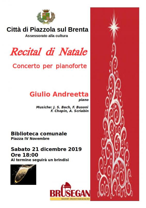 Sabato 21 Dicembre alle ore 18:00, presso la sala della Biblioteca Comunale di Piazzola sul Brenta, in Piazza IV Novembre, si terrà un recital del pianista Giulio Andreetta.