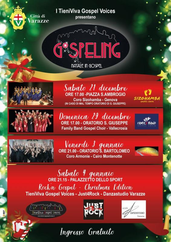 Il cartellone della seconda edizione di Gospeling prevede sulle piazze, nelle chiese, negli oratori e presso il Palazzetto dello Sport della Città di Varazze quattro spettacoli di cori Gospel Made in Liguria, di grande bravura e capaci di coinvolgere il pubblico.