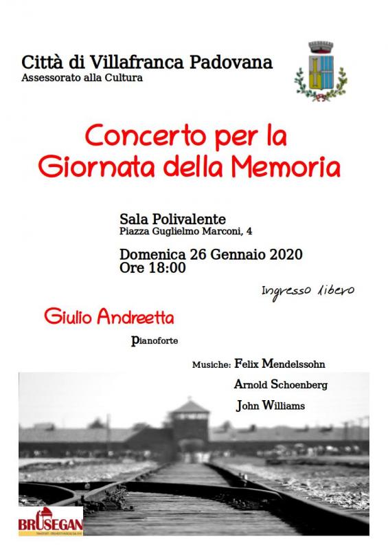 In occasione delle manifestazioni per la Giornata della Memoria, l’Amministrazione Comunale di Villafranca Padovana propone un concerto del giovane pianista e compositore Giulio Andreetta, che si terrà domenica 26 gennaio 2020 alle ore 18:00, presso la Sala Polivalente. Il Giorno della Memoria è nato per volere di una risoluzione delle Nazioni Unite nel 2005, ed è una ricorrenza internazionale con lo scopo di commemorare le vittime dell’Olocausto. Sono in programma, tra le altre, musiche di autori ebrei e rom, da Felix Mendelssohn, di cui si eseguiranno le celebri Variazioni Seriose, a Arnold Schoenberg, di cui si eseguirà l’Op. 19. Musica che venne etichettata come “degenerata” dal regime nazista in Germania, la cui violenza ideologica arrivò persino ad abbattere la statua di Mendelssohn a Lipsia nel 1936, e in generale a scoraggiare qualsiasi forma di esecuzione pubblica in concerto di compositori ebrei. Venne proibita anche la musica jazz, perché per lo più creata da musicisti di origine africana.