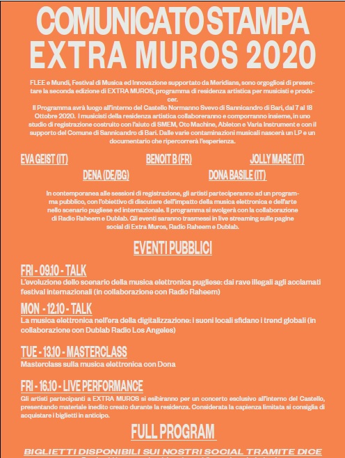 Flee e Mundi sono orgogliosi di presentare la seconda edizione di EXTRA MUROS, programma di residenza artistica per musicisti e producer.
