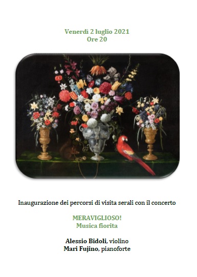 MERAVIGLIOSO! Musica Fiorita nella Casa Museo Un concerto dedicato al tema delle stagioni e dei fiori Venerdì 2 luglio alle ore 20 la Casa Museo ospita due artisti di fama internazionale, in occasione del concerto Musica Fiorita che inaugura il mese delle visite guidate serali. Il concerto sarà preceduto da tre visite straordinarie alla collezione della Fondazione Zani e alla mostra MERAVIGLIOSO! che si terranno alle ore 18:30, 18:45 e 19:00. Alessio Bidoli eseguirà al violino musiche di Wolfgang Amadeus Mozart, Ludwig van Beethoven, Camillo Sivori e Maurice Ravel, accompagnato dalla pianista giapponese Mari Fujino. Alessio Bidoli (Milano, 1986) ha iniziato lo studio del violino all’età di sette anni. Nel 2006 ha conseguito il diploma con il massimo dei voti e lode presso il Conservatorio “Giuseppe Verdi” di Milano sotto la guida di Gigino Maestri. Successivamente si è perfezionato alla Haute Ecole de Musique del Conservatorio di Losanna e al Mozarteum di Salisburgo con Pierre Amoyal, all’Accademia Chigiana di Siena con Salvatore Accardo e all’Accademia Internazionale di Imola con Pavel Berman e Oleksandr Semchuk. Mari Fujino è nata a Ishikawa in Giappone, dove a tre anni inizia lo studio del pianoforte con M°R.Kinukawa, M°J Yachie. Nel 1998 si è diplomata a Tokyo presso l’Università della Musica “TO-HO” sotto la guida del M° Izumi Komoriya, e nello stesso anno si trasferisce in Italia. Nel 2002 si è diplomata presso il Conservatorio “G.B. Martini” di Bologna con il massimo dei voti, la lode e la menzione d’onore, sotto la guida del M° Carlo Mazzoli. Nel 2003 si è diplomata al corso triennale di Musica da camera dell’Accademia Pianistica Internazionale di Imola sotto la guida del M° Pier Narciso Masi. Il concerto avrà luogo nell’Auditorium della Fondazione Paolo e Carolina Zani, uno spazio polivalente ricavato dalla trasformazione del portico maggiore della casa, in perfetta connessione e dialogo con lo spazio interno della Casa Museo e con il giardino circostante. Il programma della serata prevede la seguente scaletta: