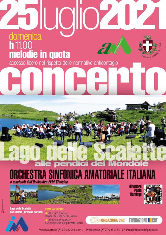 In un suggestivo contesto ad alta quota (2000 mt), il pubblico potrà apprezzare, per il secondo anno consecutivo, l’esibizione dell’Orchestra Sinfonica Amatoriale Italiana di Boves diretta dal Maestro Paolo Fiamingo e di alcuni musicisti dell’Orchestra FFM Classica di Fossano. Eseguiranno brani classici del repertorio europeo ed americano.