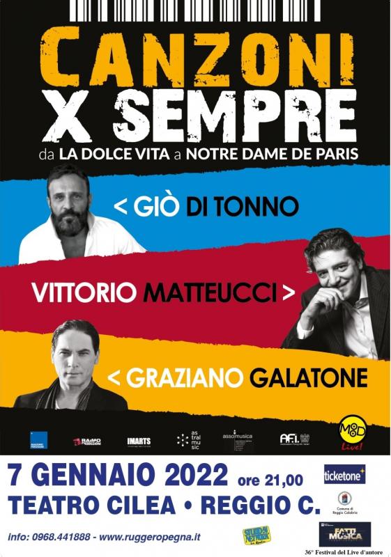 Il 7 gennaio alle ore 21 nella splendida cornice del Teatro Cilea di Reggio Calabria si svolgerà un altro evento speciale: “Canzoni per sempre – Gran Concerto di Buon Anno”, con i protagonisti delle principali opere musicali moderne, gli amatissimi Giò Di Tonno, Vittorio Matteucci e Graziano Galatone accompagnati dai loro musicisti. Sarà un concerto con una ricca scaletta di successi che raccoglierà il meglio del musical e delle colonne sonore di tutti i tempi, da West Side Story a Moulin Rouge, da Il Postino a Romeo e Giulietta, ed ancora Jesus Christ Superstar, Nuovo Cinema Paradiso, il tutto impreziosito dall’omaggio alla grande musica leggera e d’autore italiana e da quello al “loro” Notre Dame De Paris, già in programmazione a fine maggio 2022 sempre al Palacalafiore.