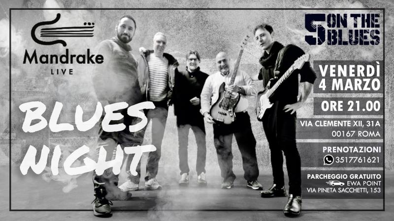 Presso l'associazione culturale Mandrake Live si esibiranno i 5 ON THE BLUES, formazione composta da musicisti di grande esperienza a livello nazionale ed internazionale, che porteranno sul palco i grandi classici di Muddy Waters, Little Walter, B.B. King, Clapton e John Mayall dal vivo.