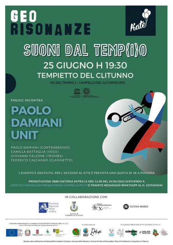 Sabato 25 giugno alle ore 19.30, a Campello sul Clitunno (Pg), in occasione dell’undicesima ricorrenza del riconoscimento UNESCO del sito “I Longobardi in Italia: i luoghi del potere (568-774 d.c.)”, la EMusic (Musica Elettromagnetica) andrà in scena nella splendida cornice del Tempietto del Clitunno, tra i più interessanti monumenti altomedievali dell’Umbria e inserito tra i sette gioielli dell’arte e dell’architettura longobarda in Italia. Un palcoscenico d'eccezione dove al calar del sole gli spettatori avranno modo di ascoltare l’autentico “Suono della Terra”, interpretato dal noto contrabbassista e Direttore Artistico del tour GeoRisonanze, Paolo Damiani, in quartetto con una serie di composizioni originali dal titolo “Sounds and Silences of the Earth”.