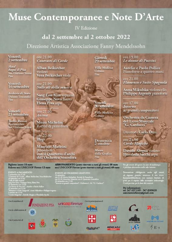 Domani venerdì 2 settembre alle 21 si apre la stagione di eventi di “Muse contemporanee e note d’arte”, una serie di concerti ed eventi organizzati sotto la direzione artistica della Associazione Musicale Fanny Mendelssohn, con il patrocinio del Comune di Pisa, di Regione Toscana, Provincia di Pisa, Comune di San Giuliano Terme e realizzata con il sostegno di Fondazione Pisa e Unicoop Firenze.