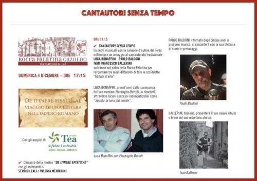 Domenica 4 dicembre, ore 17:15, presso la Rocca Palatina di Gazoldo degli Ippoliti di Mantova, un appuntamento imperdibile con la canzone d’autore: Paolo Baldoni, Ivan Francesco Ballerini e Luca Bonaffini racconteranno, attraverso un viaggio con musica e parole, le loro canzoni.