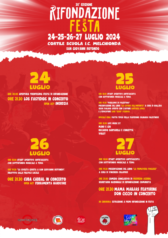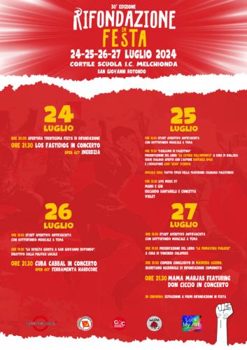 30 anni e non sentirli...Quattro giorni di cultura antifascista, musica, arte e buon cibo.Rifondazione in Festa quest'anno compie 30 anni! E vogliamo, ancora una volta, condividerlo con tutte voi e tutti voi.DAL 24 AL 27 LUGLIO SAN GIOVANNI ROTONDO SI TINGE DI ROSSO.Dibattiti, mostre d'arte, postazioni multiculturali, banchetti informativi, bar, food e tanta musica Vi attendono nel cortile della scuola elementare Melchionda.