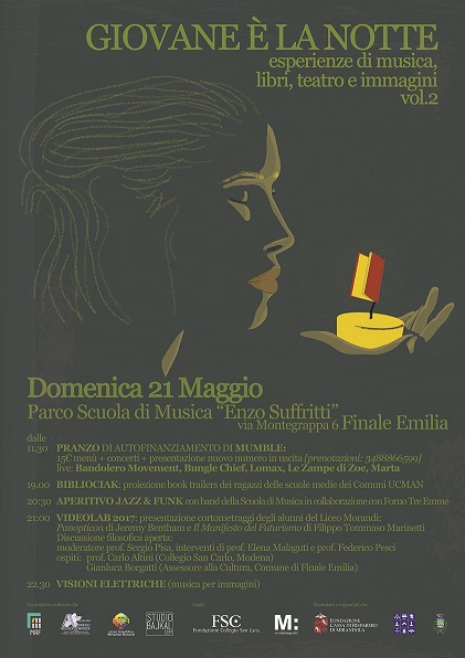 Domenica 21 maggio, invece, serata completamente dedicata alla letteratura, alla filosofia, alla musica e ai cortometraggi con “Giovane è la notte #2”, presentazione del progetto Video Lab, fortemente voluto dalla Biblioteca Pederiali di Finale Emilia, in collaborazione con Liceo Morandi e Fondazione Scuola di Musica Andreoli. Nel corso della serata verranno proiettati i cortometraggi realizzati dagli studenti del Liceo; l'evento si chiuderà con il "concerto per musica e immagini" dell'Ensamble Visioni Elettriche, diretto da Giorgio Borgatti, responsabile della Scuola di Finale e organizzatore della "Settimana della Musica".