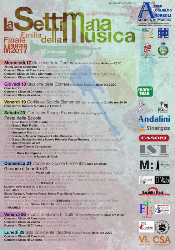 Evento aggregativo per eccellenza della settimana di appuntamenti sarà la Cena organizzata dai genitori degli studenti, in programma sabato 20 maggio nel cortile della Scuola di Musica Enzo Suffritti di Finale Emilia, donata e costruita dai volontari della Onlus "Solidarietà Vigolana" di Vigolo Vattaro, dopo il sisma del 2012.