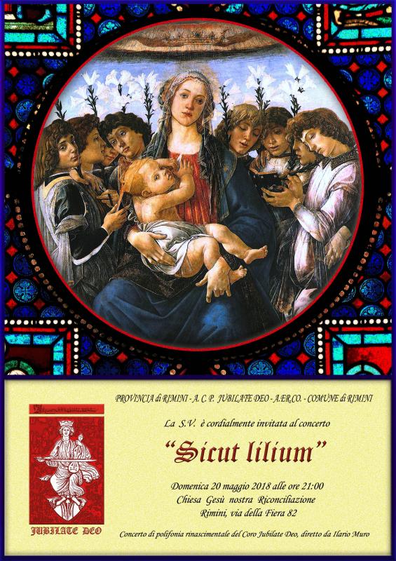 Domenica 20 maggio 2018, alle ore 21,00 presso la Chiesa GESU’ Nostra RICONCILIAZIONE di Rimini (Via della Fiera n. 72), il CORO POLIFONICO JUBILATE DEO, presenta un concerto di musica sacra intitolato: