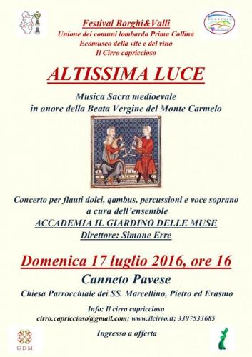 Domenica 17 luglio, alle ore 16 si terrà il concerto "Altissima Luce", organizzato in collaborazione con il festival Borghi&Valli.Si tratta di un concerto di musica sacra medioevale, in onore della Beata Vergine del Carmelo, patrona di Canneto Pavese, realizzato dall'Accademia IlGiardino delle Muse: Giorgia Conterno, voce sopranoValerio Febbroni, flauti dolciFlavio Spotti, percussioniTiziana Armonia Azzone, liutoSimone Erre, flauti dolci e direzione Saranno eseguiti brani di autori e anomini medioevali italiani, spagnoli einglesi, tra monodie, polifonie e danze popolari.La musica nel Medioevo scandiva la vita dei monaci e del clero in generale,veniva insegnata presso le università, faceva parte della sfaccettata vitadi corte, sanciva tutti i rituali della vita civile e, non ultimo, venivaeseguita nei pellegrinaggi. Questo repertorio racconta una sipritualità vissuta con gioia, nell'anima enel corpo, una fede assoluta, una fede scolpita nella pietra. Il sensoieratico di queste musiche ricorda le cattedrali romaniche con la lorospiritualità profonda e quelle gotiche con le sue altezze e durezzevertiginose.Il Giardino delle Muse è un ensemble di musicisti i cui compiti principalisono la diffusione della musica antica e la promozione di iniziativedidattiche legate al mondo della musica medievale, rinascimentale e barocca.
