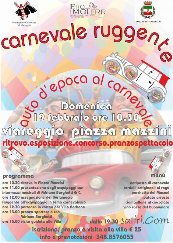 Raduno di auto d'epoca, collegato al Carnevale di Viareggio, inizio sabato 17 Special Fiat 500 (aperto comunque a tutte le auto) continua il giorno dopo Domenica 18 con esposizione in Piazza Mazzini (con spettacolo e premiazione sul grande palco del carnevale) per iscrizioni ed informazioni segreteria@promo-terr.it oppure telefonare allo 0584.32256
